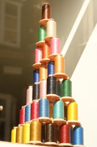 Die Pyramide hat nicht die klassische ägyptische Form, dafür ist sie deutlich farbenfroher. Die Aufnahme ist in der Neuen Straße entstanden und die Garnrollen stehen im Schaufenster eines „Handarbeitsgeschäfts“. Weil ich durch die Scheibe fotografiert habe, kann man teilweise als Spiegelung die Fenster der anderen Straßenseite erkennen. Fällt mir aber auch erst gerade auf. Auf unserer Exkursion haben wir ansonsten absichtlich Spiegelungen wie blöd fotografiert.