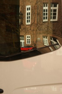 Noch mehr Spiegelung – wir haben echt viele davon aufgenommen. Vorne ein Smart (meine ich) – hinten kann ich nicht genau erkennen. Und daran erinnern schon gar nicht. Bei längerer Betrachtung fällt mir inzwischen auf, dass da anscheinend ein Gartenschlauch rumhing. Habe ich beim Fotografieren bestimmt nicht drauf geachtet.