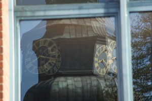 Die ganze Kirche geht natürlich nur aufs Foto rauf, wenn man weit genug weg steht. Stand ich aber nicht. Und meistens wird die Kirche auch direkt fotografiert. Ich bin ja aber gerade bei den Spiegelungen. Und – wer erkennt auf Anhieb, wie spät es ist?
